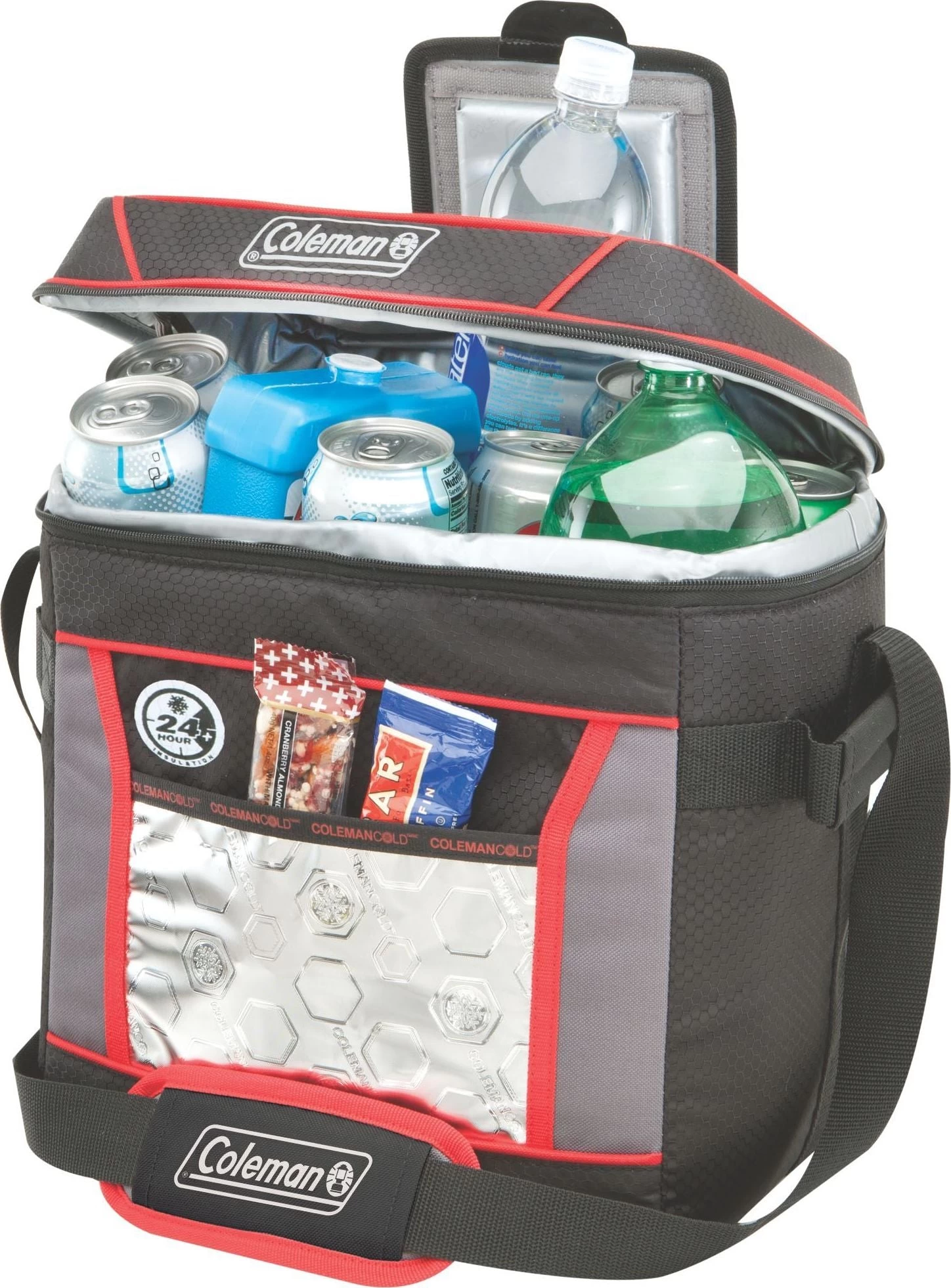 • Heat-welded seams prevent leaks|-|Gardez vos aliments et vos boissons bien au frais pendant longtemps avec la glacière 24-Hour de Coleman. Pouvant contenir jusqu’à 30 canettes, elle est parfaite pour emporter au parc ou en camping, et elle offre un maximum de fraîcheur jusqu’à 24h. Le compartiment principal est conçu de manière à emprisonner le froid, tandis que la poche avant vous permet de transporter des collations supplémentaires. Les sangles ajustables vous permettent de la transporter facilement sur votre épaule. Ce modèle est également doté d’une doublure antimicrobienne qui résiste aux odeurs et à la moisissure, ce qui en fait un modèle durable et facile à laver.