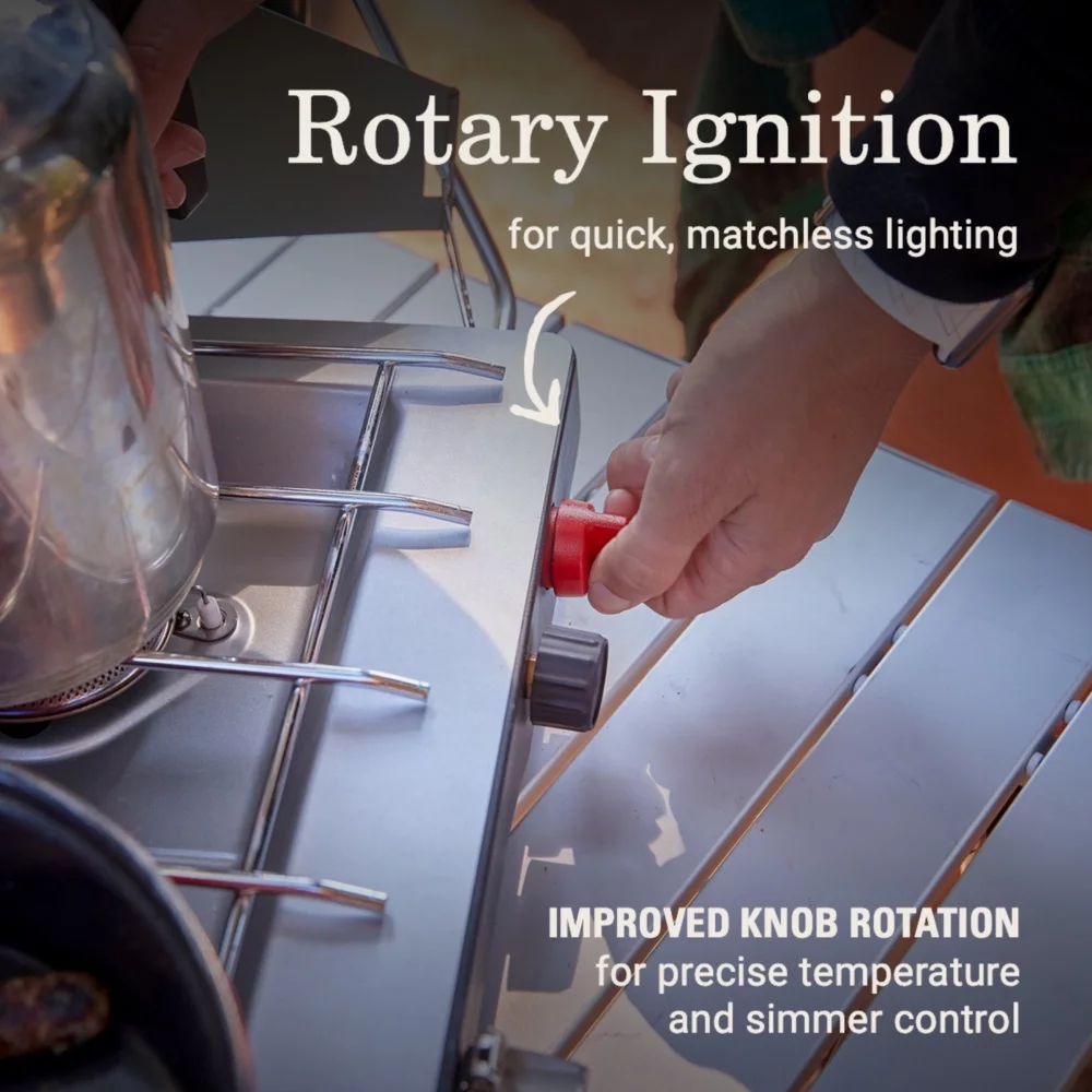 • IMPROVED COOKING CONTROL: Improved knob rotation for precise temperature and simmer control of 2 adjustable burners; rotary ignition for quick, matchless lighting