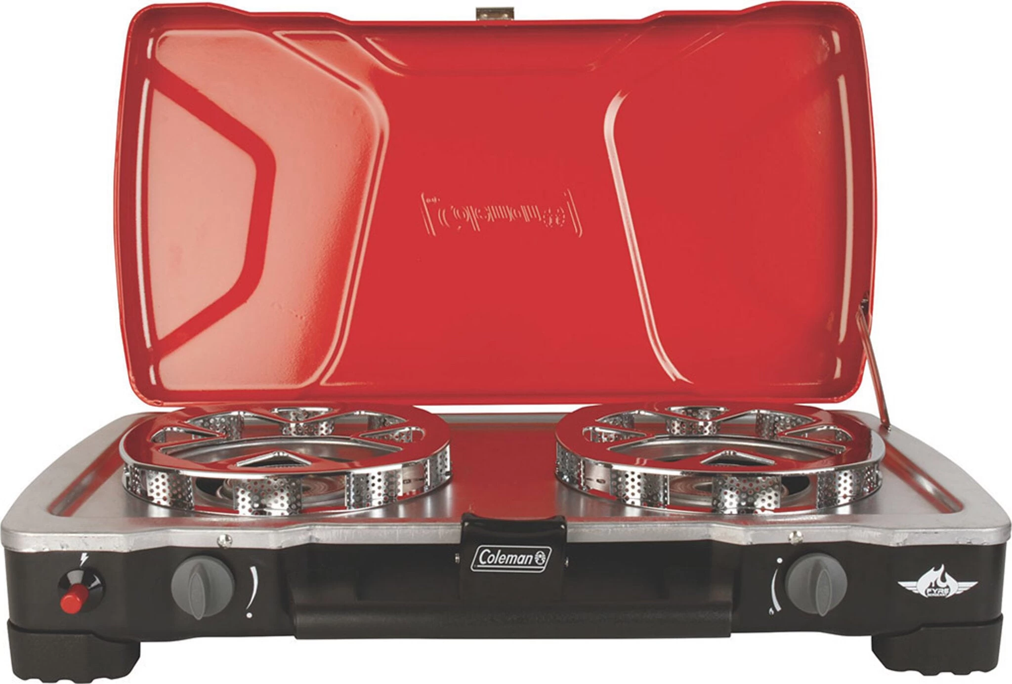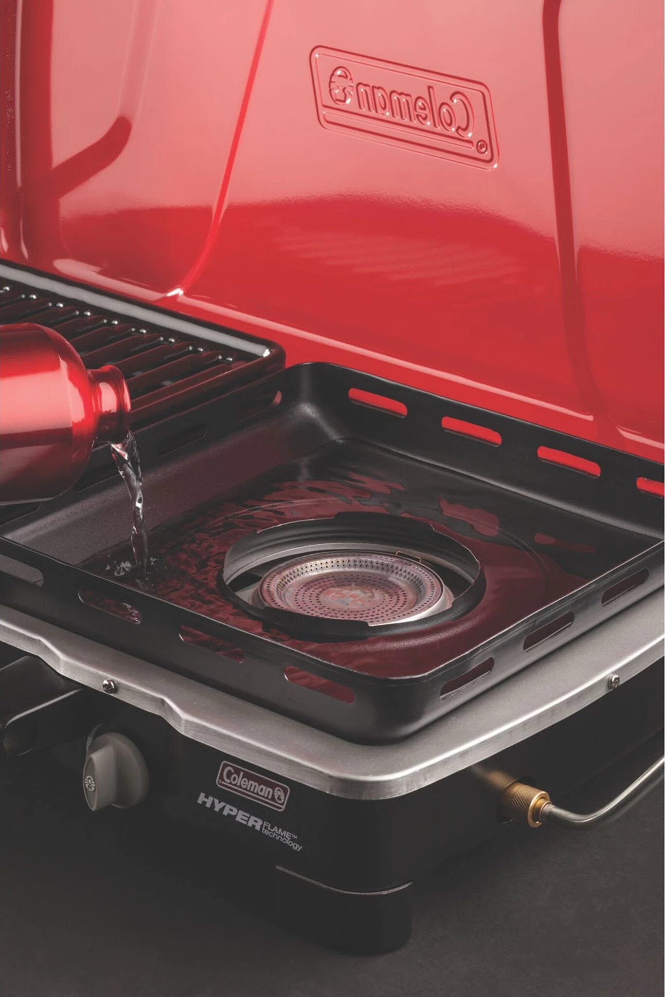 Serve up a family feast in no time with the Coleman® FyreSergeant™ 3-IN-1 Propane Stove. Each 11,000-BTU burner utilizes our revolutionary HyperFlame® technology, which provides an even heat distribution across the pan and better wind resistance to cut boiling time in half when compared to a standard burner in 3m/sec wind. Wind Block™ pan supports also provide 360° of wind protection and eliminate the need for side panels so you can use up to a 12-in. and 10-in. pan at the same time. It comes with two Swaptop™ compatible grill grates, which can be changed out with the included pan supports or a griddle(sold separately)to expand your meal options. The grill grates each incorporate a DripTrap™ water pan that catches grease for easy cleaning in the dishwasher. When you’re ready to cook, just hit the Instastart™ push-button ignition and dial in your heat with the two independently adjustable burners. The PerfectFlow™ pressure control technology produces a steady fuel stream and consistent burner performance in all kinds of weather. When you’re done cooking, the built-in handle and latching lid make for easy carrying back home until you’re ready to create your next camping culinary masterpiece.
