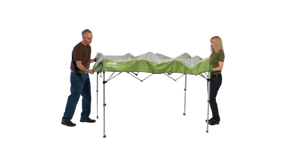 The Coleman 10 x 16 Foot Instant Shelter with Swing Wall provides a footprint of 10″x10″ of extended shade or low angle sun protection. Comfort grip technology helps protect fingers from pinching and makes setup and take down a breeze. The simple, one piece frame design sets up in about 3 minutes. With a center eight of 9 feet 4 inches you will be able to stand up straight.![]()