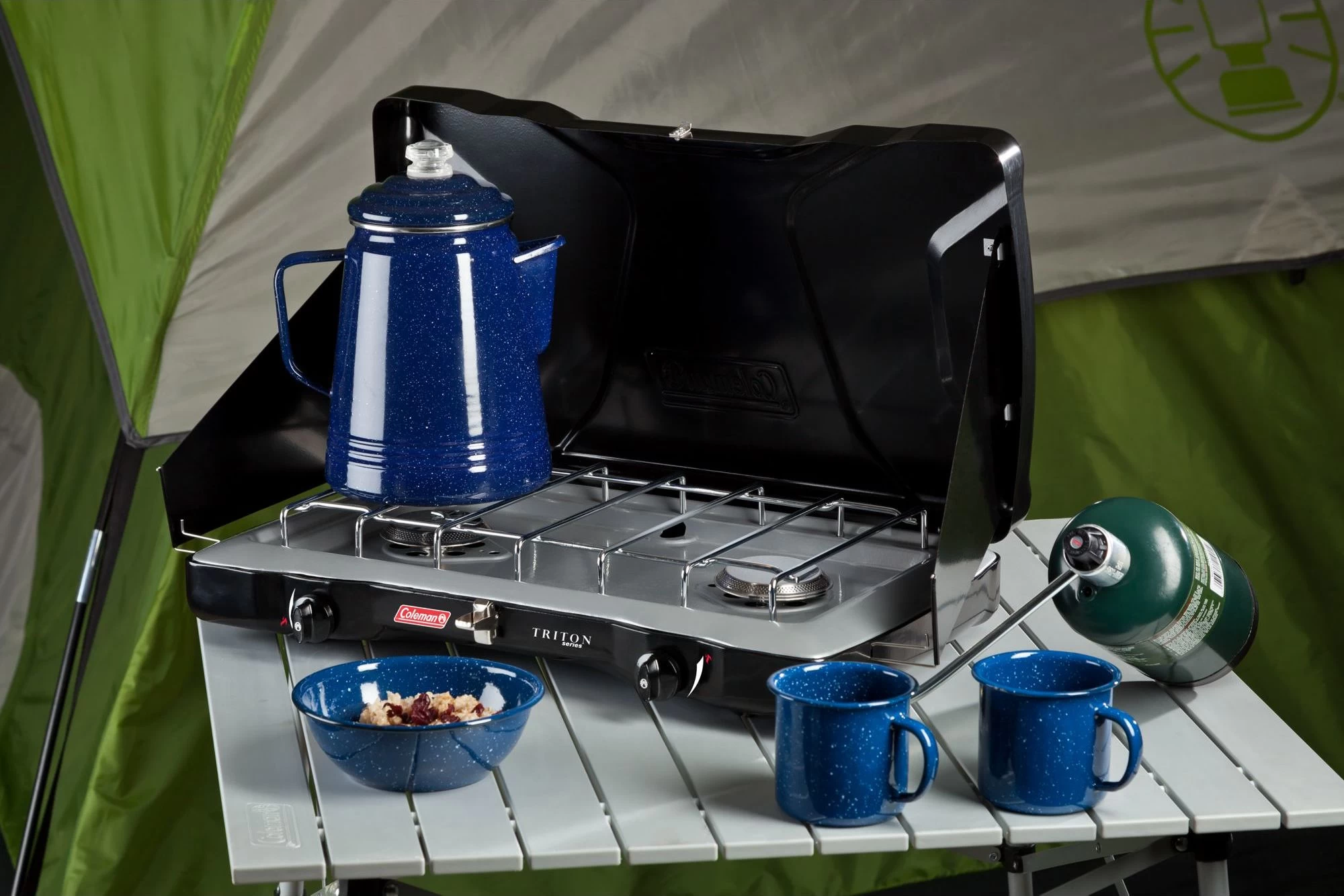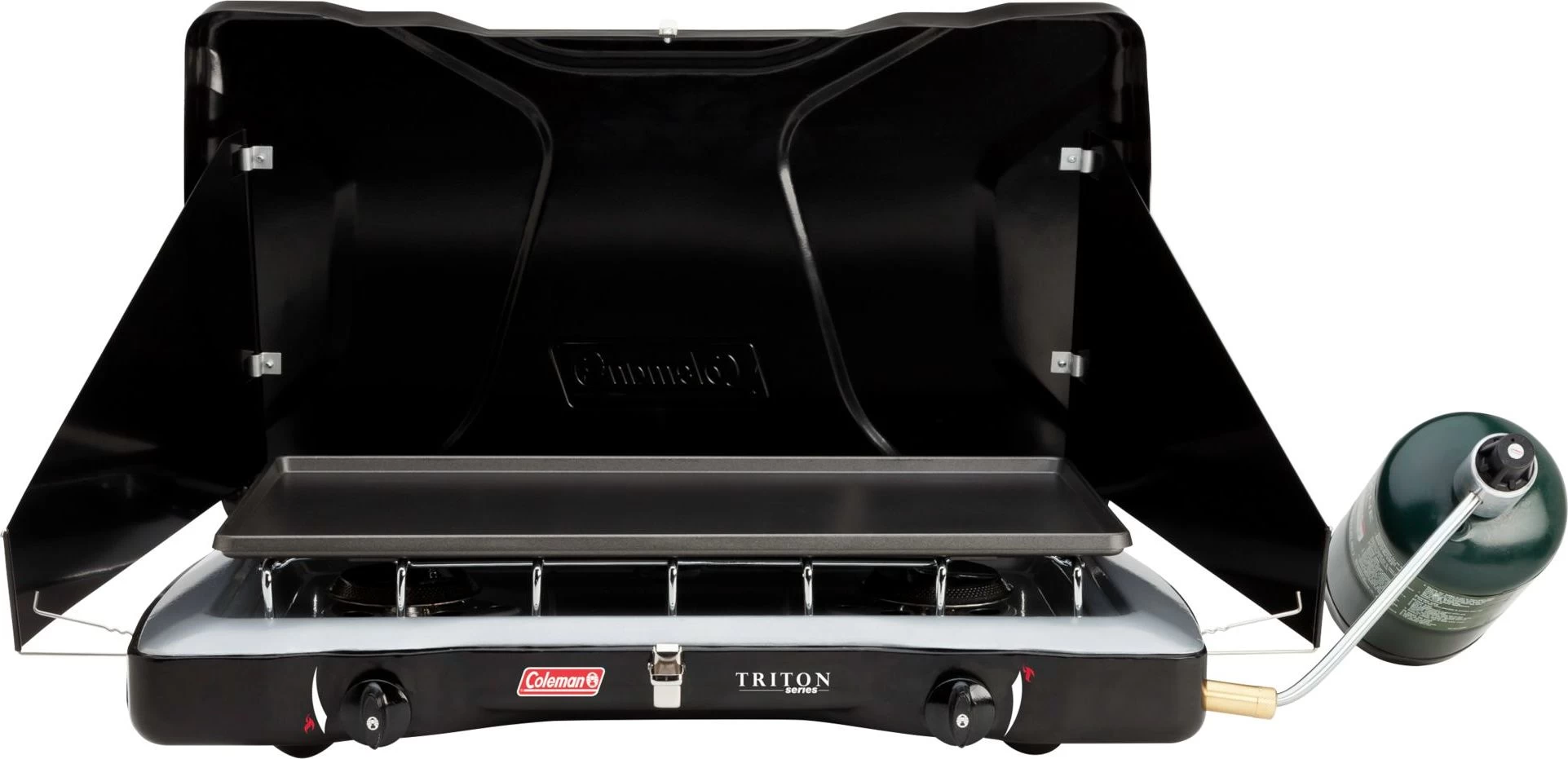 Take camp cooking to the next level with the Coleman® Triton™ 2-Burner Propane Stove. Just light it up and dial in your heat with the two independently adjustable burners. The cooking surface offers plenty of room to fit a 12-in. and 10-in. pan simultaneously. Meanwhile, the PerfectFlow™ pressure control technology keeps the heat steady, even in extreme conditions. WindBlock™ panels help shield your flame from wind, and they adjust if you need to fit a larger pan. When the meal is over, the chrome-plated grate removes for simple and quick cleanup, and the heavy-duty latch will keep the lid secure until you whip up your next family dinner.