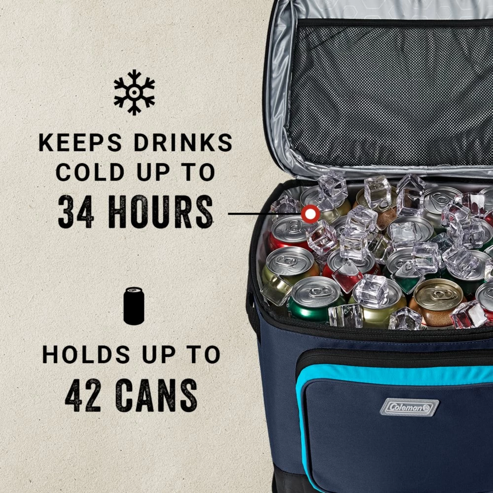 Roll with it to your next tailgate party, annual family picnic, or kid’s soccer game with the Coleman® XPAND™ 42-Can Soft Cooler. Wheels and telescoping handles make the cooler easy to haul to and from wherever you want to go. Active-Stretch™ front pocket expands to fit all your gear throughout the day so even after you store your phone, keys, or snacks, you’ll still have more room to stash other items and the 4Way stretch side mesh pocket easily fits a water bottle. The padded top handle lets you carry the cooler comfortably even when packed to the brim and a bungee cord offers additional space for a jacket or blanket in case you need to bundle up. Out for a while? Food and drinks stay cold up to 34 hours so you’ll always have your crew’s favorite snacks and beverages at hand. The antimicrobial leakproof liner helps prevent odor, mildew, and mold from forming so you can feel confident using this cooler again and again.
